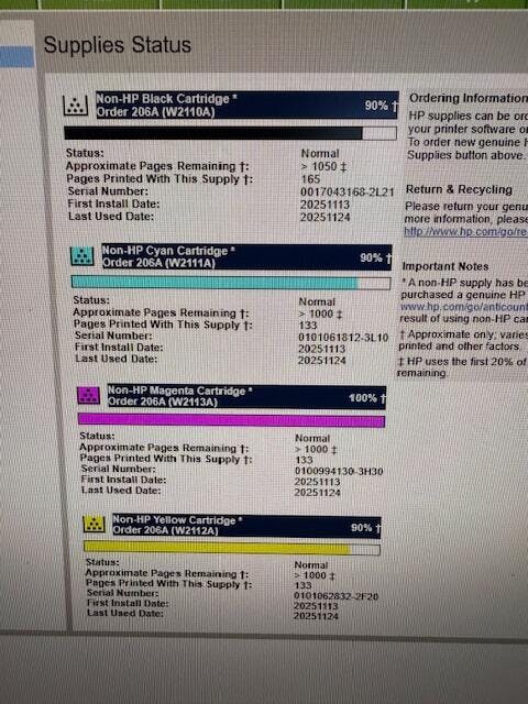 I fell for the upsell for the updated chips that state "Firmware-Safe Version: Safe Against HP Firmware Updates & No "Non-HP Chip Detected" Error." The printer still alerts Non-HP toner warning and states Non-HP cartridge on the supplies summary. But, the 206X toner does print great in my M283; I just don't know if paying the extra $60 was necessary for the "updated" vs "compatible" chips.